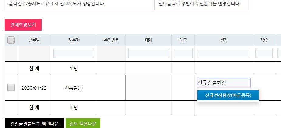 1. 현장/노무자 배치일보에서도 동일하게 위 기능이 적용되었습니다.