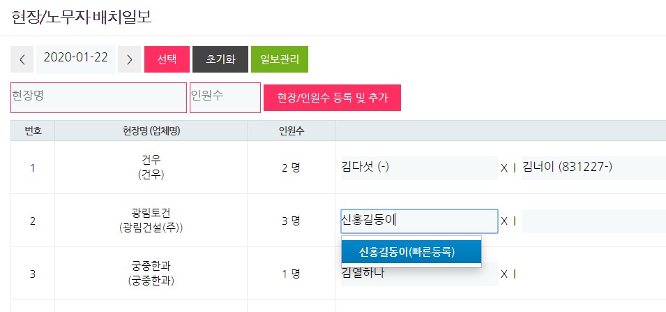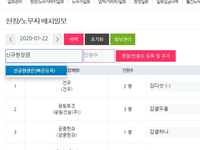 - 일보관리에서 신규 노무자 직접 입력
