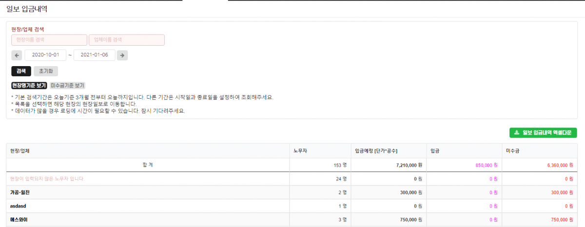 2. 일보입금내역 엑셀다운로드 기능 추가