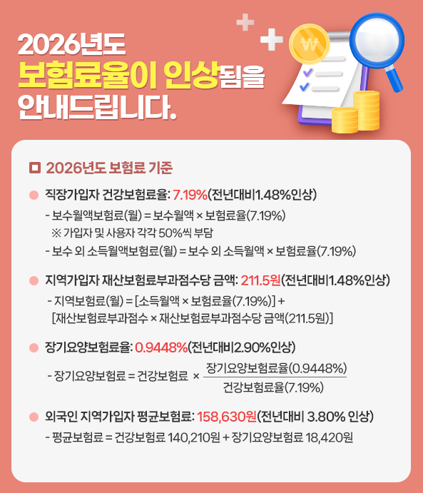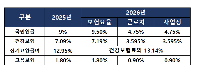 2026년도 국민연금과 건강보험 요율이 아래와 같이 인상되었습니다.