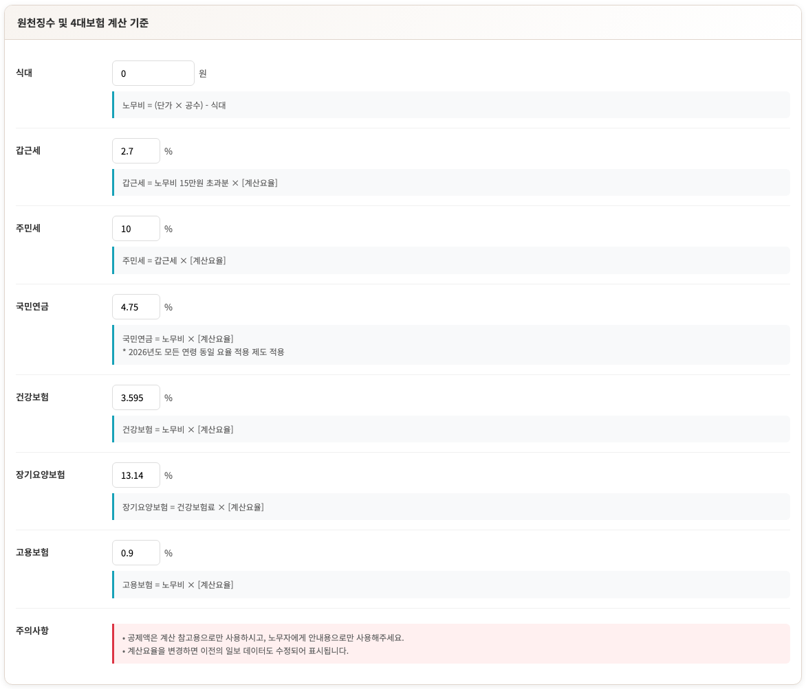 위 내용 참고 하시어, 2026년도 4대보험료 및 세금 계산에 적용해주세요.