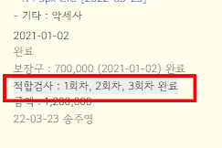 - 위 "보장구 적합관리"에서 해당 회차를 완료 처리한 경우 위 회차 대상자 표기가 되지 않습니다. 대신 적합검사 완료 구분이 표기됩니다.