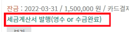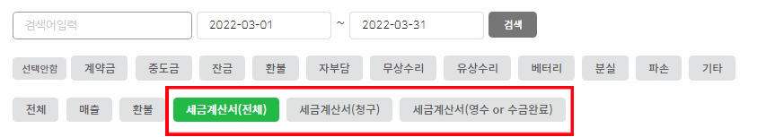 - 세금계산서 발행구분이 "세금계산서 발행(청구)" 또는 "세금계산서 발행(영수 or 수금완료)"가 선택되면 목록에 아래와 같이 표기됩니다.