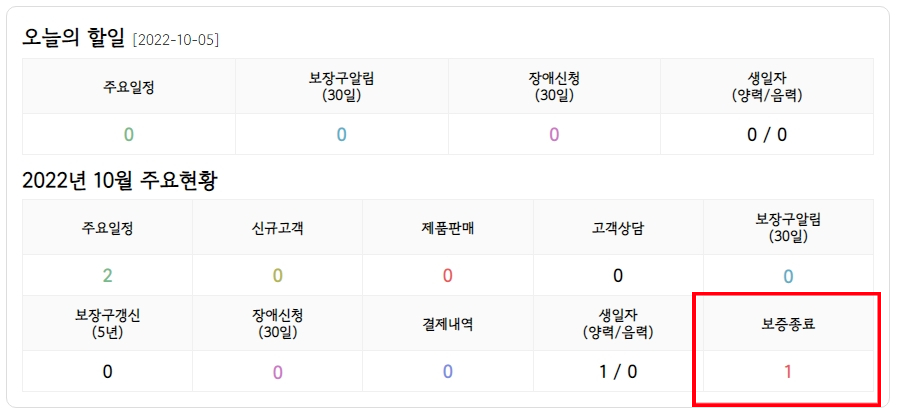 - 고객목록 및 스케줄러에 보증종료 문구 및 카운트가 표기 됩니다.