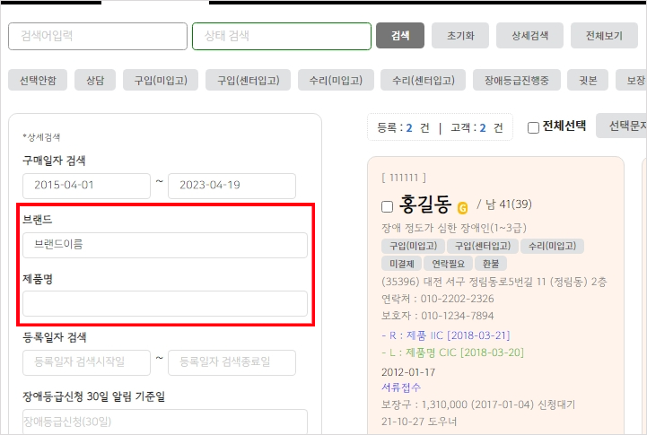 및 고객관리 상세검색에 (브랜드/제품) 검색 기능 추가
