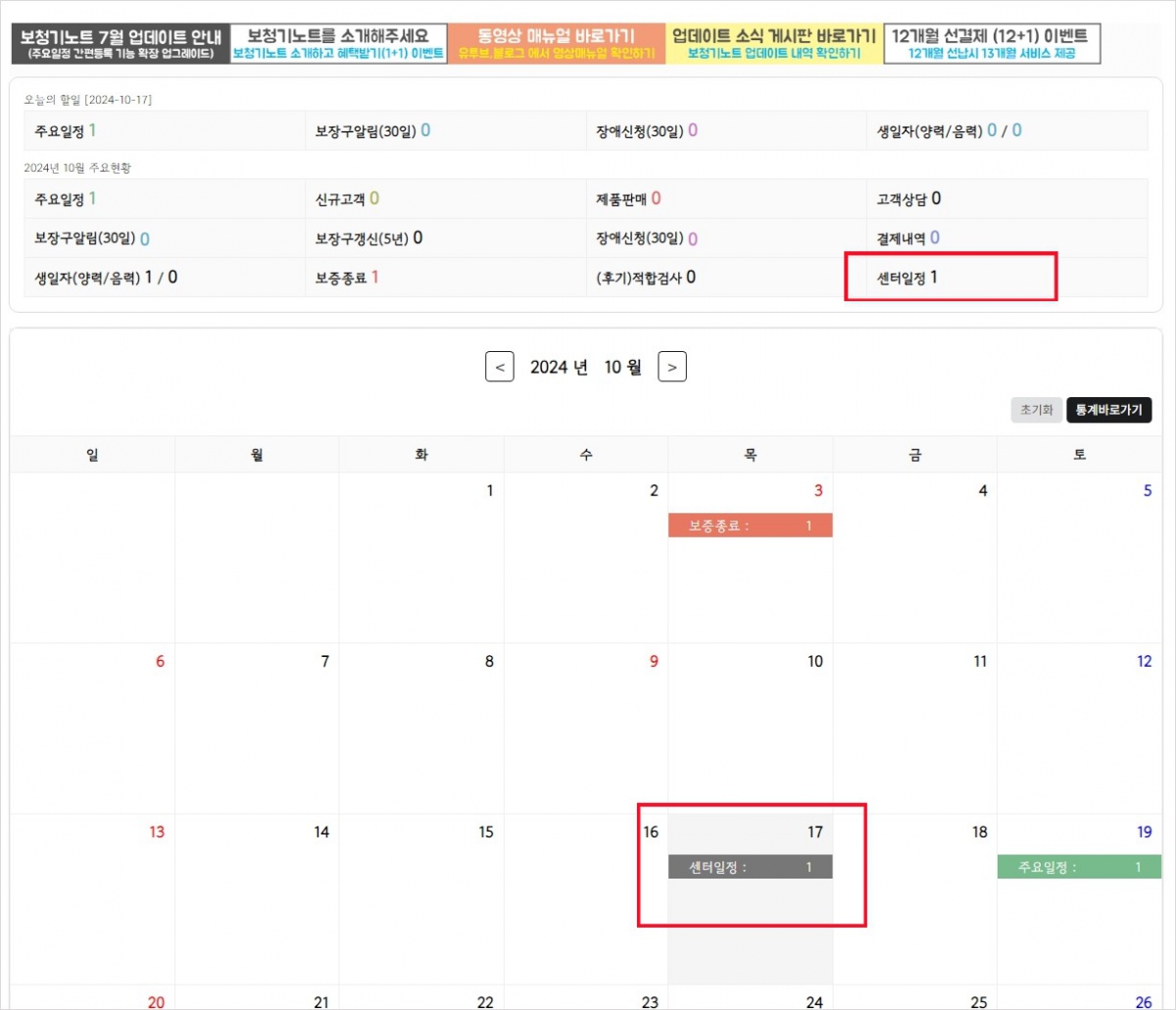 센터 운영을 위하여 센터의 주요일정 ( 담당자 연차, 제고관리, 교육, 회식 등) 일정 등을 공유하기 위해 기능이 추가되었습니다.