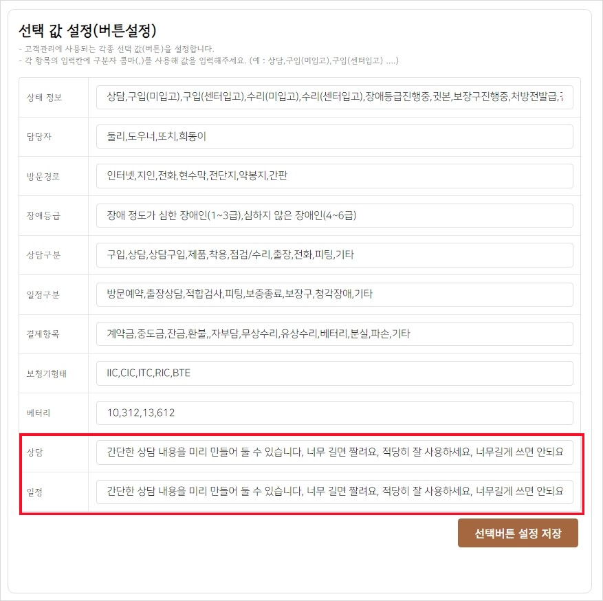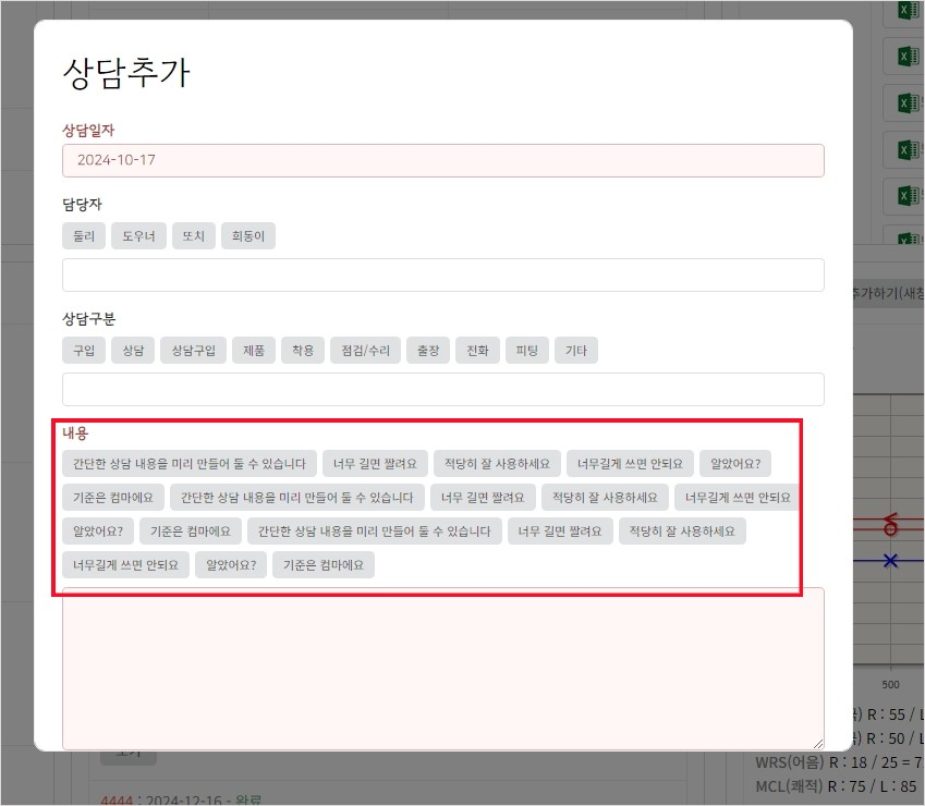 - 상담은 상담내역 추가시 내용 부분의 간편 등록버튼에 기능이 추가되었습니다.